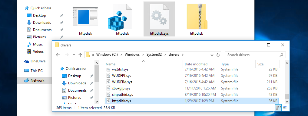 ทำการ Copy ไฟล์ httpdisk.sys ไปวางไว้ที่ c:\windows\system32\drivers ส่วน httpdisk.exe นำไปวางไว้ที่ c:\windows